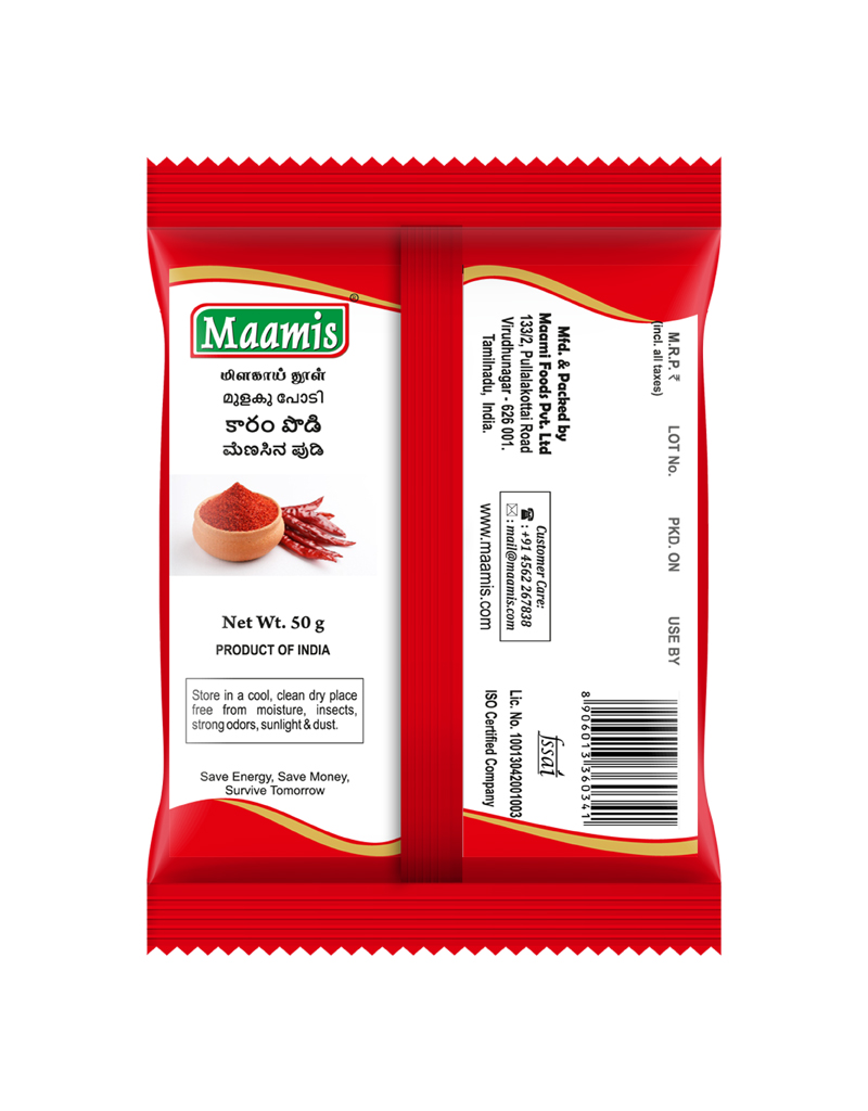 - Specification : This Product is manufactured by grinding clean and dried Red Chillies without loosing its characteristic taste and flavor
